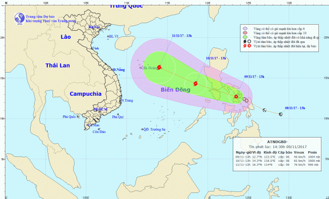 Trung tâm Dự báo Khí tượng Thủy văn Trung ương cho biết, hồi 13 giờ ngày 9/11, vị trí tâm áp thấp nhiệt đới ở vào khoảng 12,7 độ Vĩ Bắc; 123,5 độ Kinh Đông trên khu vực miền Trung Philippines. Sức gió mạnh nhất ở vùng gần tâm áp thấp nhiệt đới mạnh cấp 6-7 (40-60km/giờ), giật cấp 9.