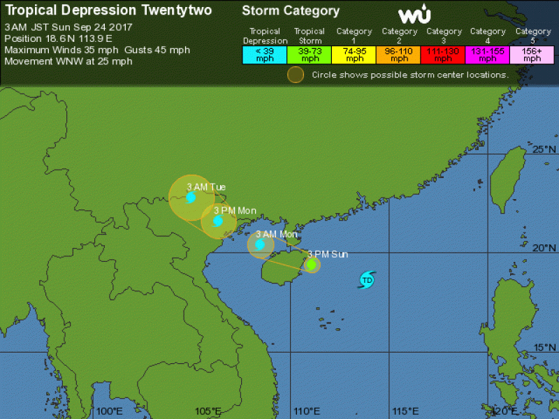 Theo dự báo của trang thời tiết WuderGround, áp thấp nhiệt đới có tên thứ tự là 22 hiện đang di chuyển nhanh và ảnh hưởng trực tiếp đến khu vực đảo Hải Nam (Trung Quốc) dự kiến vào 4 giờ chiều nay 24/9, sau đó tiếp tục ảnh hưởng đến các tỉnh phía Đông bắc Việt Nam trong rạng sáng ngày thứ hai 25/9 với cường độ gió dưới 65 km/h. Người dân các khu vực cần đề phòng giông lốc xảy ra.