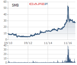 Tháng 11/2016 cổ phiếu SMB bất ngờ trải qua những phiên tăng mạnh, đạt đỉnh ở mức giá xấp xỉ 55.000 đồng/cổ phiếu. Tuy nhiên sau đó đã điều chỉnh giảm và hiện giao dịch quanh vùng giá 27.300 đồng/cổ phiếu.