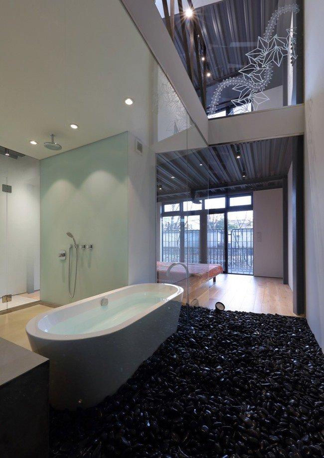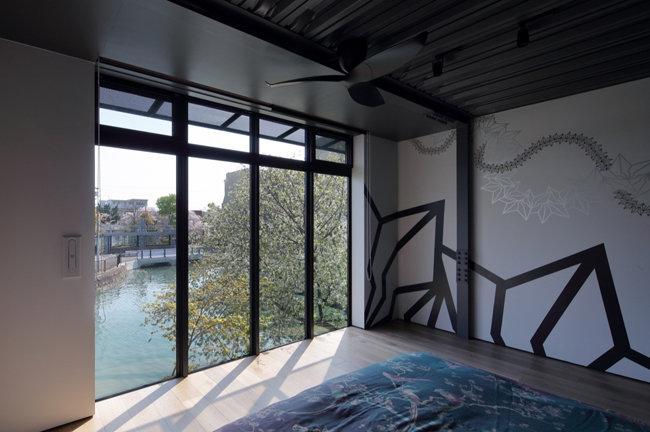 Thiết kếnhà ở theo phong cách Nhật Bảnđang trở thành xu hướng khi con người ngày càng hướng tới sự đơn giản hóa nhưng vẫn tiện nghi, thoải mái và trang nhã trong không gian sống.Ngôi nhà này là một gợi ý lý tưởng cho những ai đang tìm kiếm một phong cách nhà ở tinh tế, hiện đại và không quá cầu kì.Ngôi nhà nằm trên một con phố yên tĩnh ở Kyoto, Nhật Bản.Nó được thiết kế gồm 3 tầng với tổng diện tích 230 m2.Được thiết kế bởi kiến trúc sư từng tu nghiệp tại New Zealand, không khó để nhận ra, căn nhà cũng mang trong mình bóng dáng của những công trình phương tây.Chủ nhà là một cặp vợ chồng trẻ, thích đi du lịch và khám phá.Yêu cầu của họ là một không gian sống thoải mái, không bị cảm giác bó buộc bởi các bức tường nhưng vẫn phải ấm cúng và cho họ cảm giác yên bình.Tầng trệt của ngôi nhà là khu vực tiếp khách. Tầng 2 là phòng ngủ chính. Tầng 3 là khu vực sinh hoạt chung, bếp và bàn ăn. Cuối cùng là sân thượng với mái kính và một khu vườn xanh mướt mắt.Mặt tiền được làm bằng tường gỗ chịu lửa, tách biệt với con đường phía trước bởi một khoảng sân khá rộng.Mặt tiền độc đáo.Toàn bộ mặt phía bắc của ngôi nhà được làm bằng kính trong suốt khung thép chắc chắn, mang lại tầm nhìn tuyệt vời ra con sông phía sau nhà.Toàn bộ nội thất khá đơn giản.Trần nhà được làm bằng khung thép, sàn nhà bê tông và cầu thang được làm bằng thép thô.Không gian bếp được trang trí khá bắt mắt với điểm nhấn là một bức tranh được các nghệ sĩ địa phương vẽ trực tiếp lên tường.Phòng ngủ.Tường kính được sử dụng khá nhiều trong ngôi nhà.Phòng tắm sang trọng.Phòng tắm nằm ngay cạnh phòng ngủ chính.Sàn nhà tắm được rải đá như các Spa.