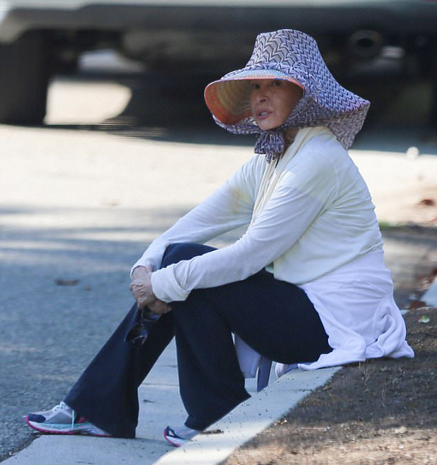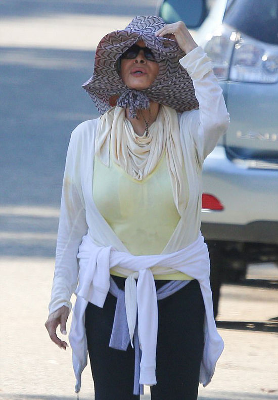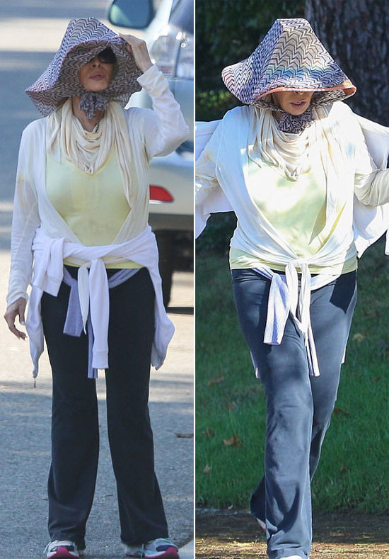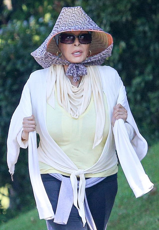 Minh tinh Raquel Welch đội mũ, trùm khăn và mặc áo chống nắng kín mít khi đi bộ tập thể dục ở Los Angeles.