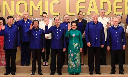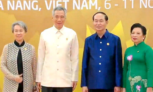 Lễ đón chính thức các nhà lãnh đạo và tiệc chiêu đãi, biểu diễn nghệ thuật chào mừng Hội nghị cấp cao APEC 2017 diễn ra tối 10/11 ở Đà Nẵng.Chủ tịch nước Trần Đại Quang cùng phu nhân Nguyễn Thị Hiền chủ trì buổi lễ.