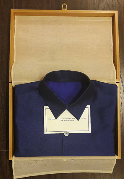 Hộp đựng trang phục được chế tác từ tre, màu sắc giữ nguyên gốc của chất liệu tre, tạo nét đẹp tự nhiên, trang trọng. Tên các vị khách được khắc chìm trên miếng đồng gia công tỉ mỉ. Họa tiết Bảo tướng liên hoa trên bậc thềm rồng điện Kính Thiên, Hoàng thành Thăng Long, Hà Nội, được chạm nổi ở mặt hộp. Hộp trang phục đặt trong một túi xách may bằng lớp lụa tơ tằm loại đặc biệt với sợi tơ sống, một mặt thêu logo APEC 2017, lớp lót bằng lụa sa vân dệt chìm hoa văn cổ truyền trong suốt.