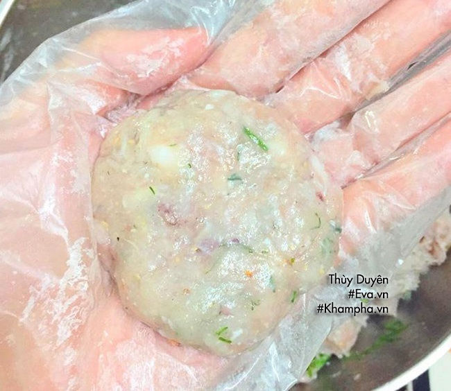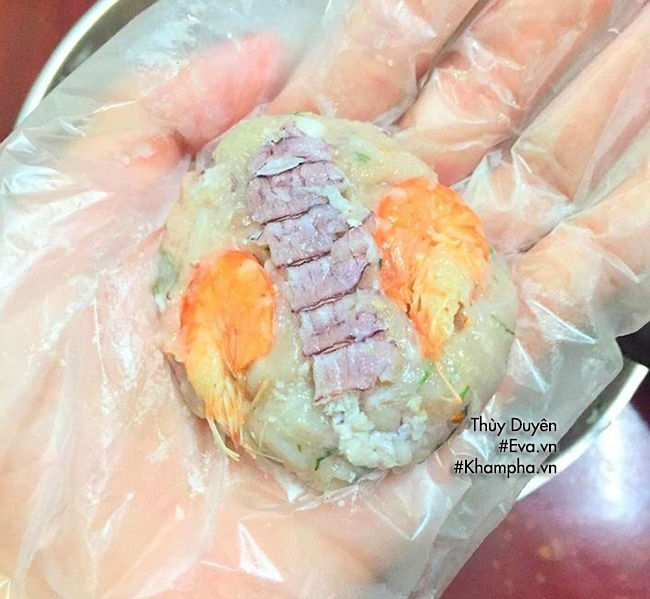 Bước 2: Đeo bao tay nilon, xoa chút dầu ăn rồi lấy từng chút chả từ âu ra nặn dẹt, đặt bề bề và tôm nõn vào chính giữa miếng chả. Cứ làm lần lượt như vậy cho đến khi hết lượng chả trong âu.