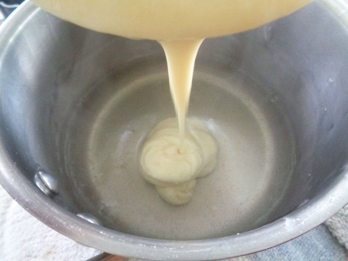 Nấu thêm 1-2 phút là tắt bếp. Đổ 1 lớp mỏng thạch sầu riêng vào khuôn. Chỗ thạch còn lại cho lên bếp để giữ nóng.