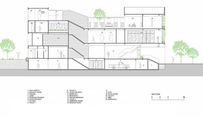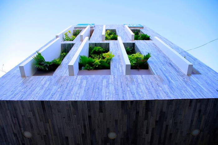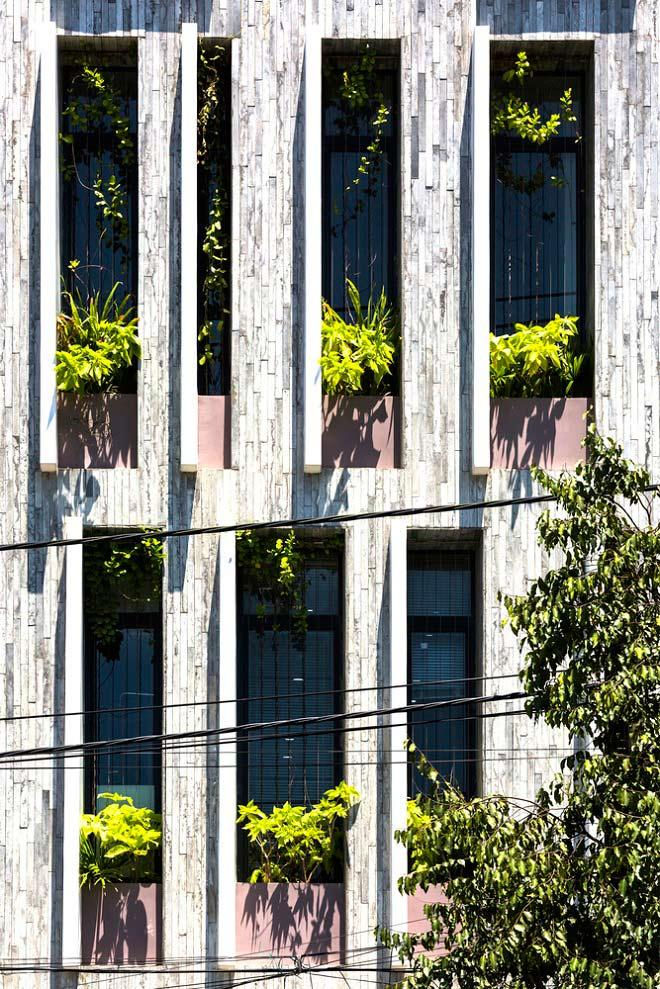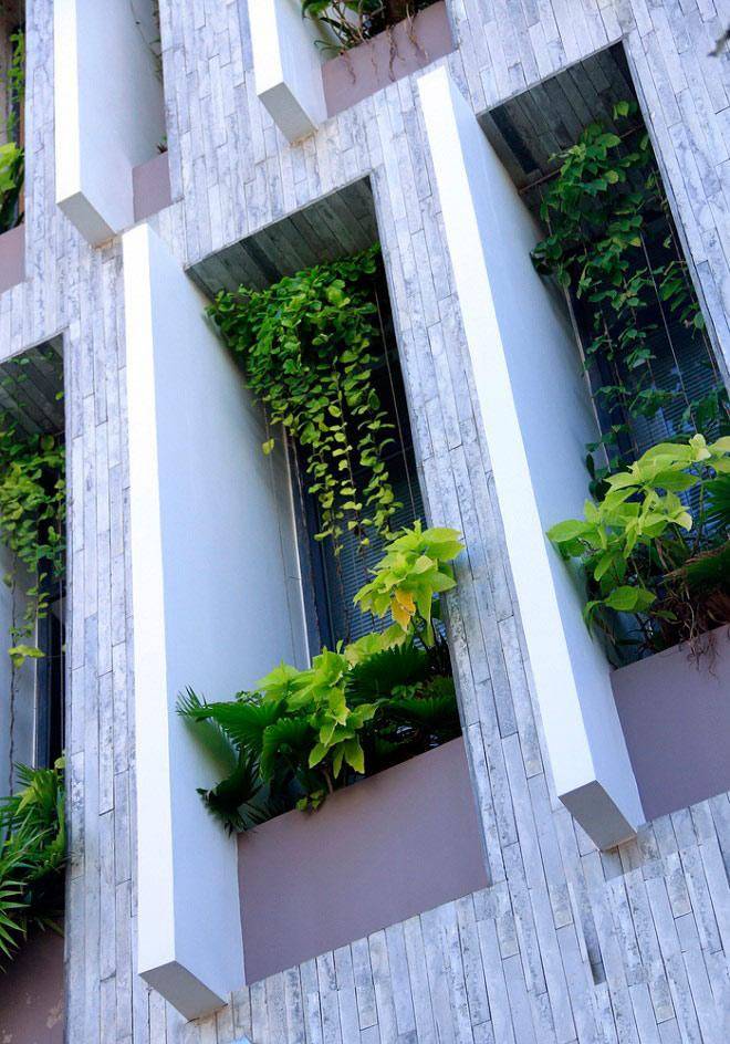 Để xây dựng nên căn nhà, các KTS đã sử dụng những tấm bê tông đúc sẵn để tạo mặt tiền nhằm tiết kiệm cả thời gian lẫn chi phí trong quá trình thi công. Những tấm bê tông này được kết hợp một cách hoàn hảo để tạo nên những ô cửa sổ dọc dài ở mặt tiền nhằm mục đích trồng thêm cây xanh trang trí, giảm tiếng ồn và ô nhiễm.