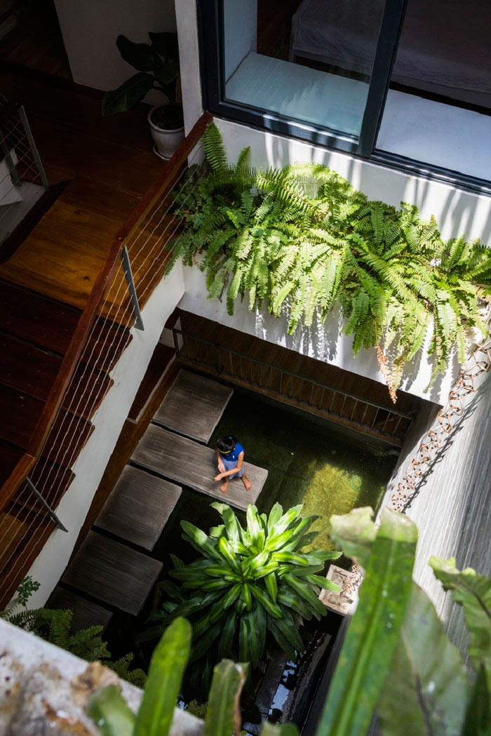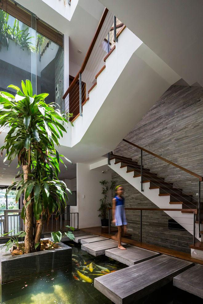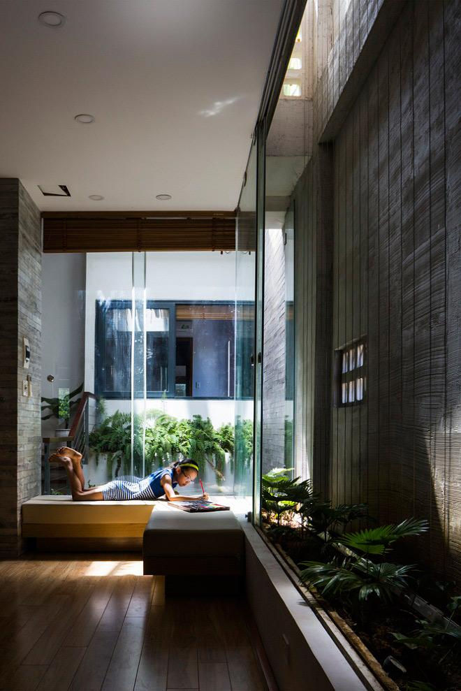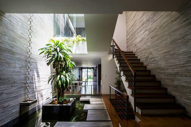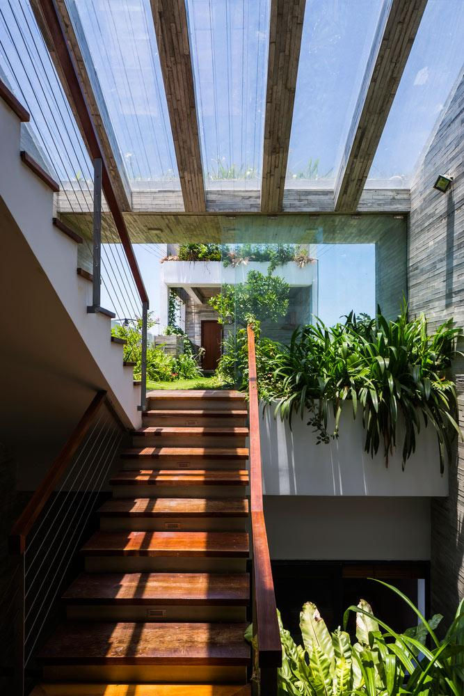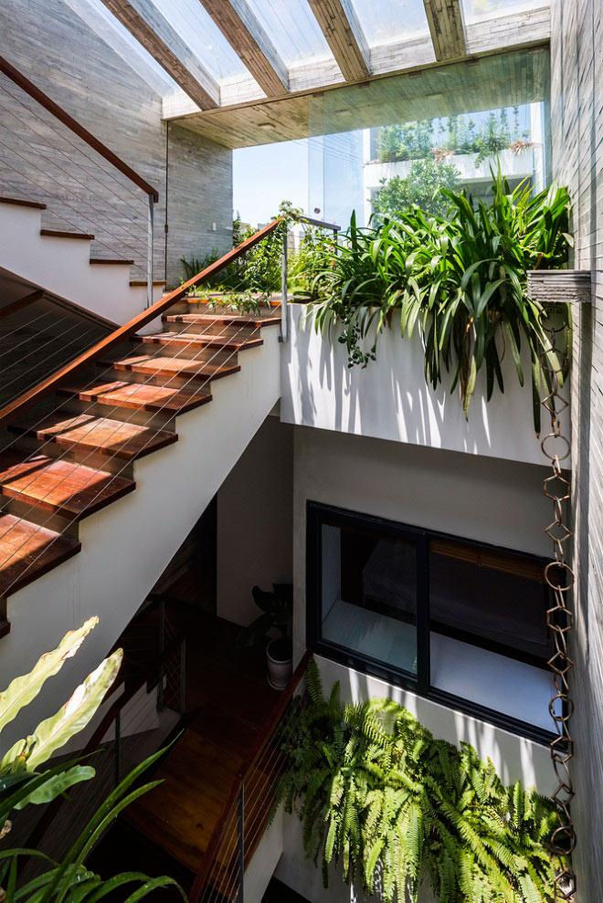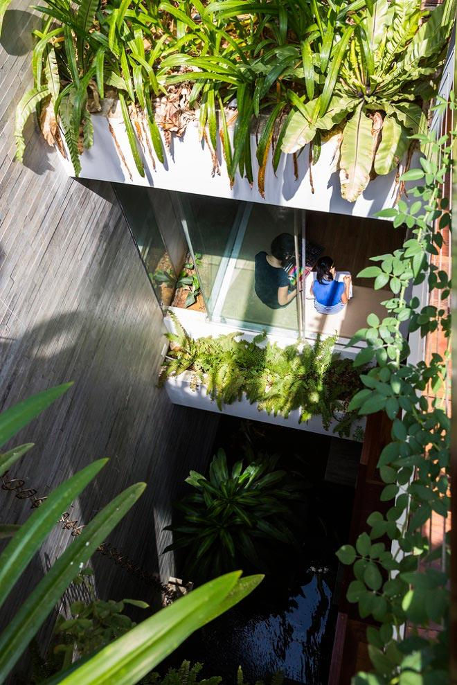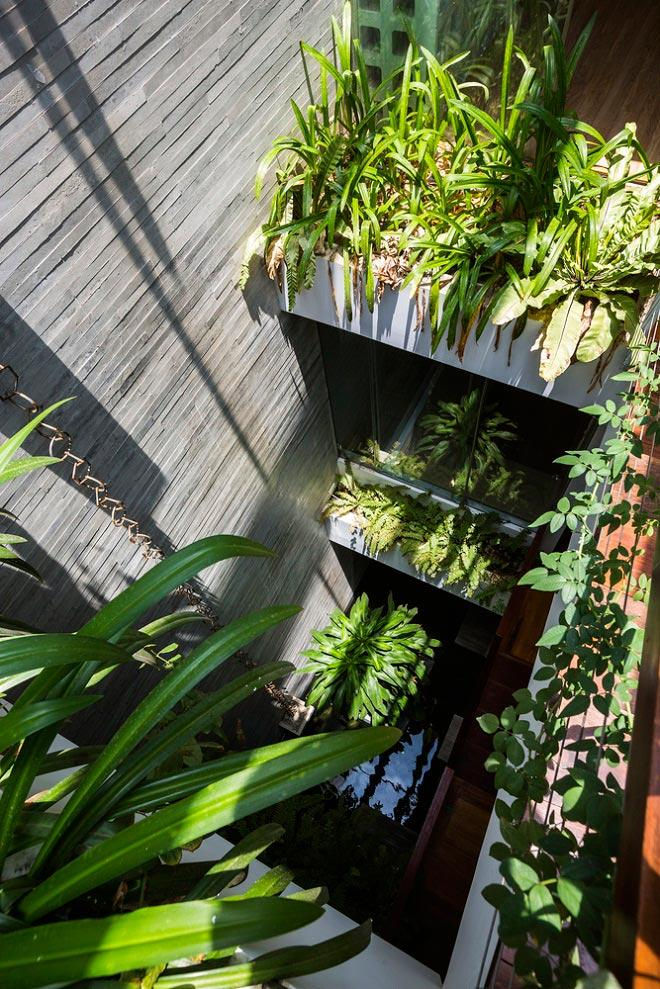 Cùng với công viên mini, đểgiải quyết yếu tố thông gió và ánh sáng cho ngôi nhà, các KTS đã tạo ra những khu vườn xanh ở trung tâm, đảm bảo được 5 yếu tố:Kim, Mộc,Thủy, Hỏa, Thổ cùnghòa hợp với nhau, tạo ra không khí mát mẻ, giúp con người gần gũi với thiên nhiên hơn.