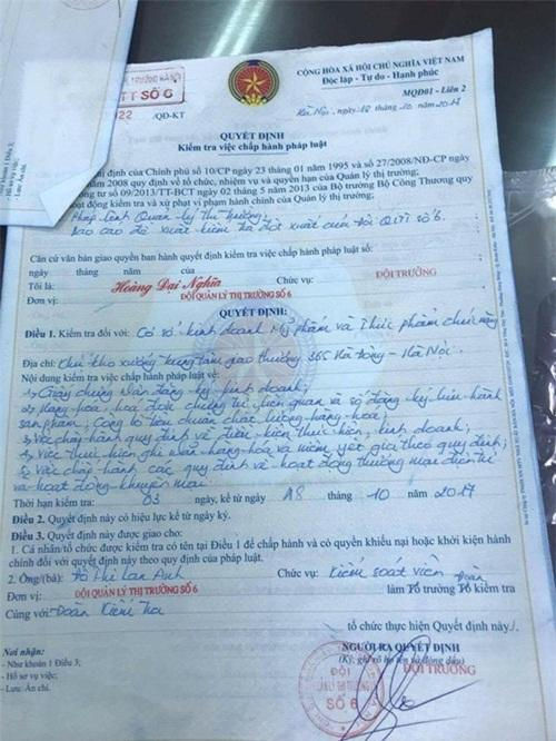 Cụ thể, ngày 18/10, Đội Quản lý thị trường số 6 (Chi Cục quản lý thị trườngHà Nội) đã kiểm tra đột xuất Công ty TNHH Thiên nhiên TS Việt Nam (địa chỉ tại Lô 18, Khu hành chính mới phường Hà Cầu, quận Hà Đông, Hà Nội) do bà Nguyễn Thu Trang làm Giám đốc.