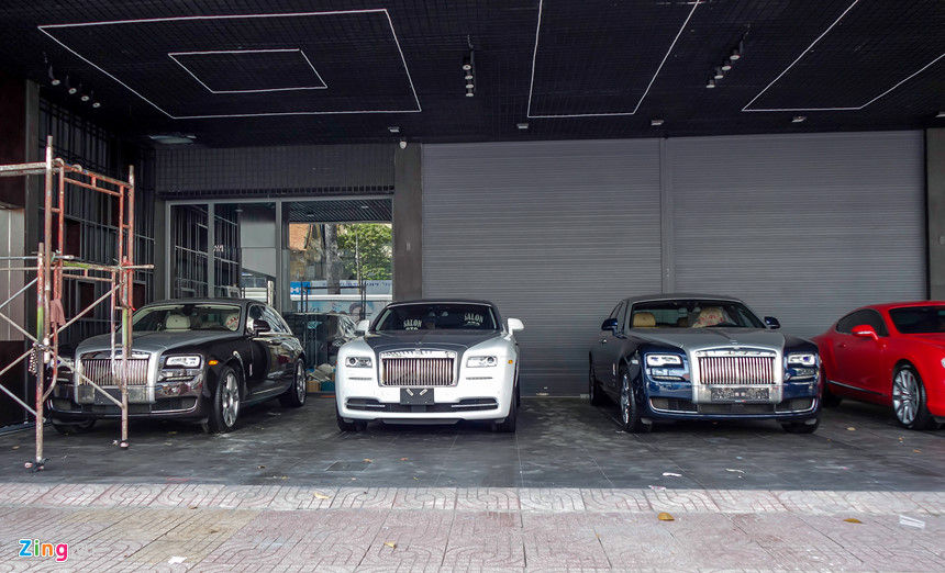 Trên phố xe hơi An Dương Vương, TP.HCM, có một cửa hàng chỉ trưng bày những loại xe đắt tiền, gồm 4 chiếc Ferrari 488 GTB, 3 chiếc Rolls-Royce và một chiếc Bentley.