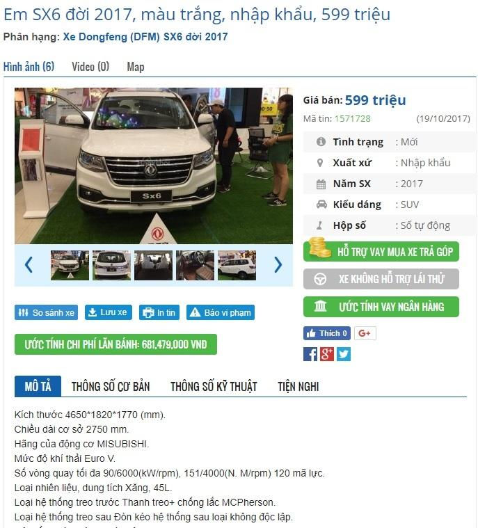 Một chiếc DongFeng SX6 1.6L CVT tại đây đang được bán với giá 629 triệu đồng, tặng 25% phí trước bạ, giá lăn bánh khoảng 700 triệu đồng. Đây là chiếc crossover sở hữu động cơ theo nhà sản xuất ghi là của Mitsubishi, dung tich 1,6L, công suất 90 mã lực, hộp số tự động vô cấp CVT, cùng bảng thông số kỹ thuật kín đặc cả trang A4.