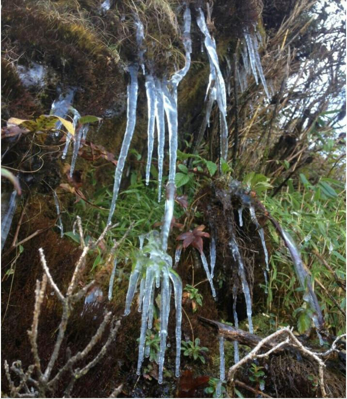 Trên đỉnh Fansipan, một số triền núi dốc, băng đóng thành hình lưỡi kiếm. Nhiệt độ ngoài trời xuống 0 độ C.
