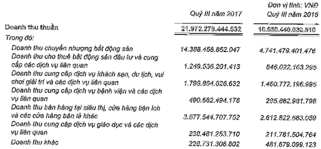 Đóng góp chính vào kết quả kinh doanh quý 3 vẫn là doanh thu chuyển nhượng bất động sản, 14.388 tỷ đồng, tăng 203,5% so với cùng kỳ năm trước.