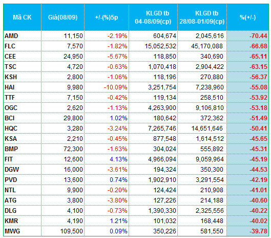 Không chỉ FLC, những cổ phiếu có liên quan như AMD và HAI đều có thanh khoản giảm 70% và 55% so với tuần trước, lần lượt ở mức 604,000 cp/phiên và 3.2 triệu cp/phiên. Cả HAI và AMD cũng đều giảm giá trong tuần qua.