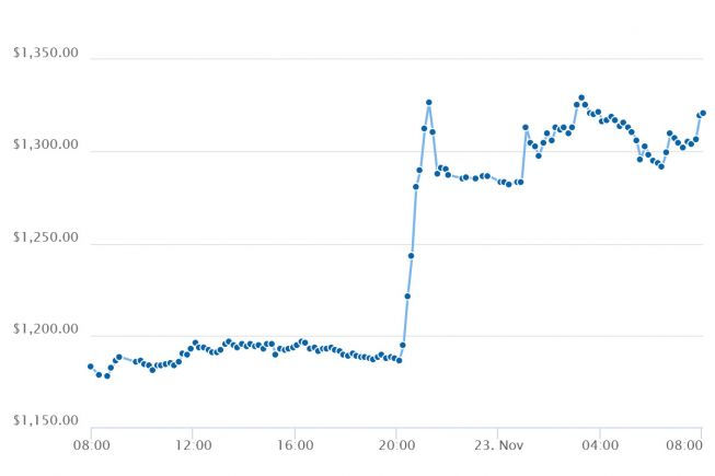 Trong khi Bitcoin đứng giá thì đồng tiền điện tử chia tách Bitcoin Cash lại đạt con số tăng trưởng mạnh hơn 12% trong 24 giờ qua từ con số 1.187,06 USD lúc chốt phiên giao dịch hôm qua. Lúc 8hngày 23/11, Bitcoin Cash đạt giá trị 1.320,58 USD, nâng tổng vốn hóa thị trường lên 22 tỷ USD.