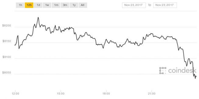 Ghi nhận tại thời điểm 7h 24/11 theo giờ Việt Nam, giá Bitcoin đạt 8.164 USD, giảm 2,6% giá trị so với giá mở cửa trong phiên giao dịch. Trong 12 giờ qua, giá Bitcoin dao động ở mức từ 8.150 USD đến 8.230 USD và được dự đoán không có bất kỳ biến động mạnh trong phiên cuối tuần.