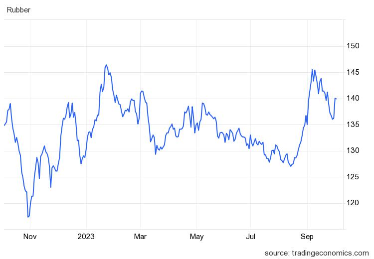 Tại sàn TOCOM, giá cao su kỳ hạn giao tháng 10/2023 tăng 0,35% lên mức 228,8 yen/kg. Trên sàn SHFE, giá cao su RSS3 kỳ hạn tháng 10/2023 tăng 0,12% lên mức 12.580 nhân dân tệ/tấn so với giao dịch trước đó.