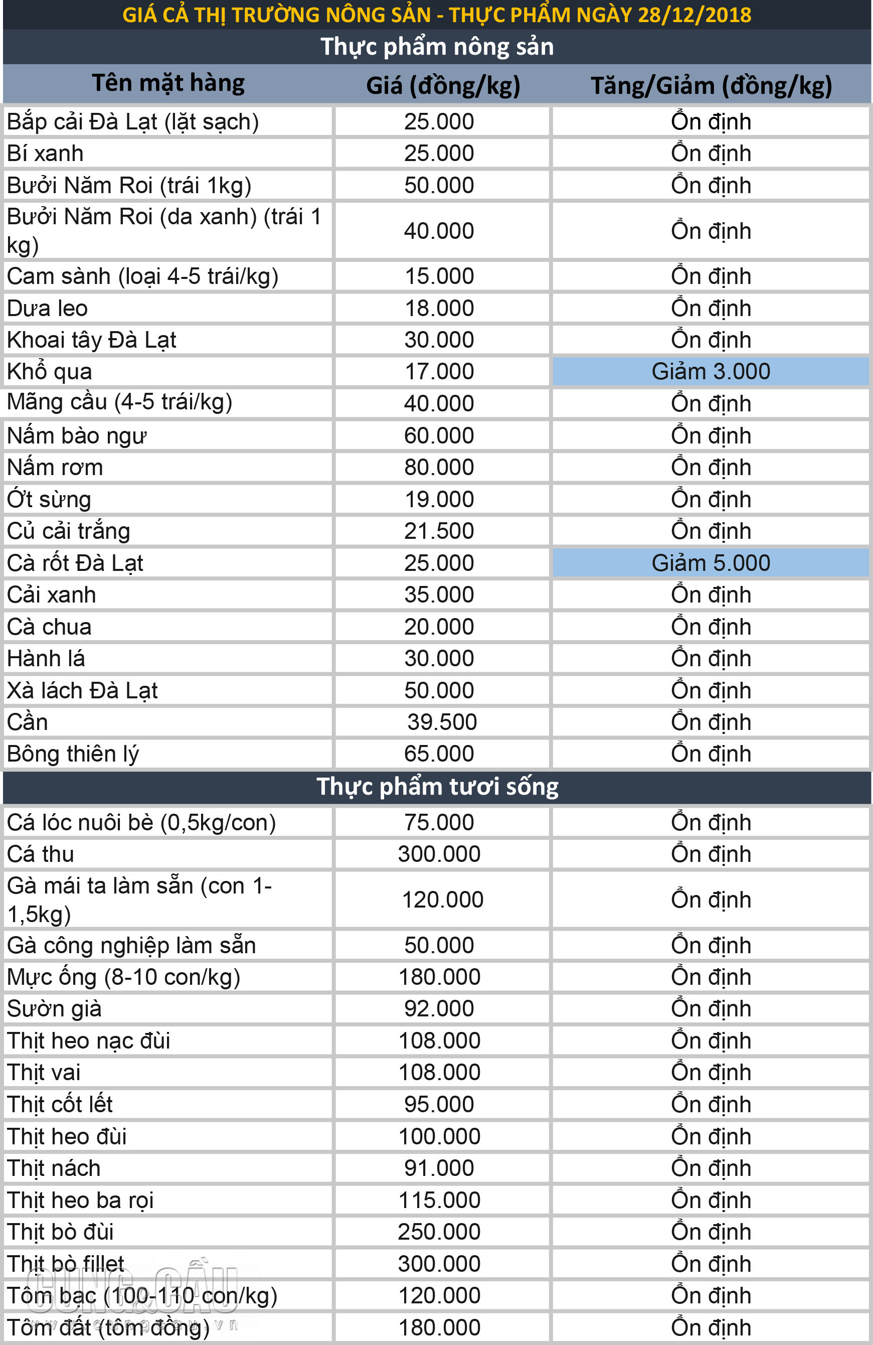 Trước dịp tết Dương lịch 2019, thực phẩm nông sản bất ngờ giảm giá, trong đó khổ qua từ 20.000 đồng/kg giảm xuống còn 17.000 đồng/kg, cà rốt Đà Lạt giảm từ 30.000 đồng/kg xuống còn 25.000 đồng/kg.