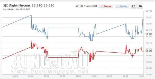 Chốt phiên 9/11, giá vàng SJC được Công ty Vàng bạc đá quý Sài Gòn giao dịch ở ngưỡng 36,45triệu đồng/lượng (mua vào) - 36,65triệu đồng/lượng (bán ra) tại TP.HCM và 36,45triệu đồng/lượng (mua vào) - 36,67triệu đồng/lượng (bán ra) ở thị trường Hà Nội.