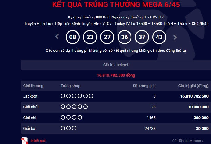 TheoCông ty xổ số điện toán Việt Nam (Vietlott), kỳ quay số mở thưởng thứ 188loại hình xổ số điện toán Mega6/45 đã mở thưởng vào chiều tối hôm nay (1/10).Bộ số may mắn trong kỳ quay thưởng lần này là: 08-23-27-36-37-43.