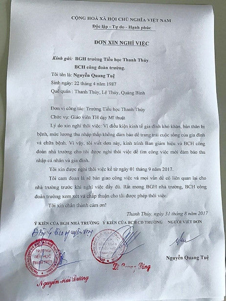 Những ngày qua, mạng xã hội chia sẻ hình ảnh lá đơn xin nghỉ việc vì lương thấp. Người viết đơn là Nguyễn Quang Tuệ (sinh năm 1987), dạy Mỹ thuật tại trường Tiểu học Thanh Thủy (Lệ Thủy, Quảng Bình).
