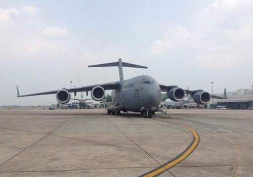 Sau hai giờ hạ tải hàng hóa phục vụ cho chuyến thăm của Tổng thống Mỹ, máy bay vận tải hạng nặng Boeing C-17 đã rời đi.