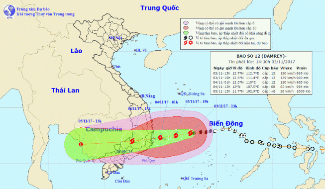 Trong khi đó, bão Damrey tiếp tục tiến vào đất liền với sức gió giật trên cấp 15. Cụ thể, lúc 13 giờ ngày 3/11, vị trí tâm bão ở vào khoảng 12,7 độ Vĩ Bắc; 112,7 độ Kinh Đông, cách bờ biển Phú Yên-Khánh Hòa-Ninh Thuận khoảng 350km về phía Đông. Sức gió mạnh nhất ở vùng gần tâm bão mạnh cấp 12 (115-135km/giờ), giật cấp 15.