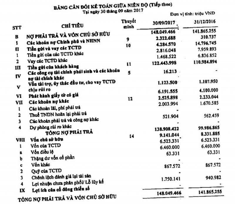 Lũy kế 9 tháng đầu năm, thu nhập lãi thuần đạt trên 3.900 tỉ đồng, tăng 43% so với cùng kỳ năm trước. Hoạt động mua bán chứng khoán đầu tư mang về gần 300 tỉ đồng, trong khi 9 tháng đầu năm 2016 lỗ gần 230 tỉ đồng. Chi phí hoạt động tăng gần 50% với 1.839 tỉ đồng, dự phòng rủi ro tín dụng tăng 25% lên mức 474 tỉ đồng.