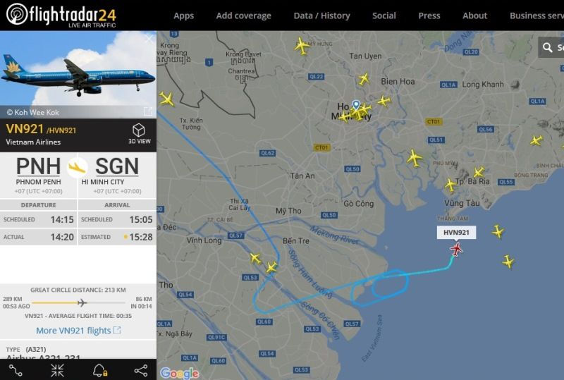 Chuyến bay VJ826 của VietJet Air từ Malaysia về TP.HCM phải bay vòng khu vực Long Thành một vòng trước khi có được sắp lượthạ cánh. Tương tự, chuyến bay 3K557 của Jetstar Airways từ Singapore đến Sài Gòn cũng bay vòng khu vực Long Thành - Mỹ Xuân đến hơn 2 vòng.