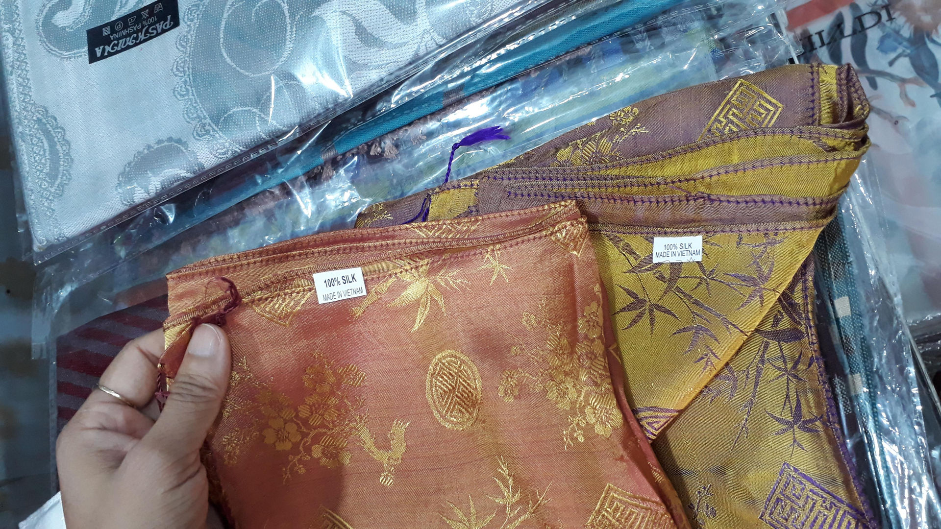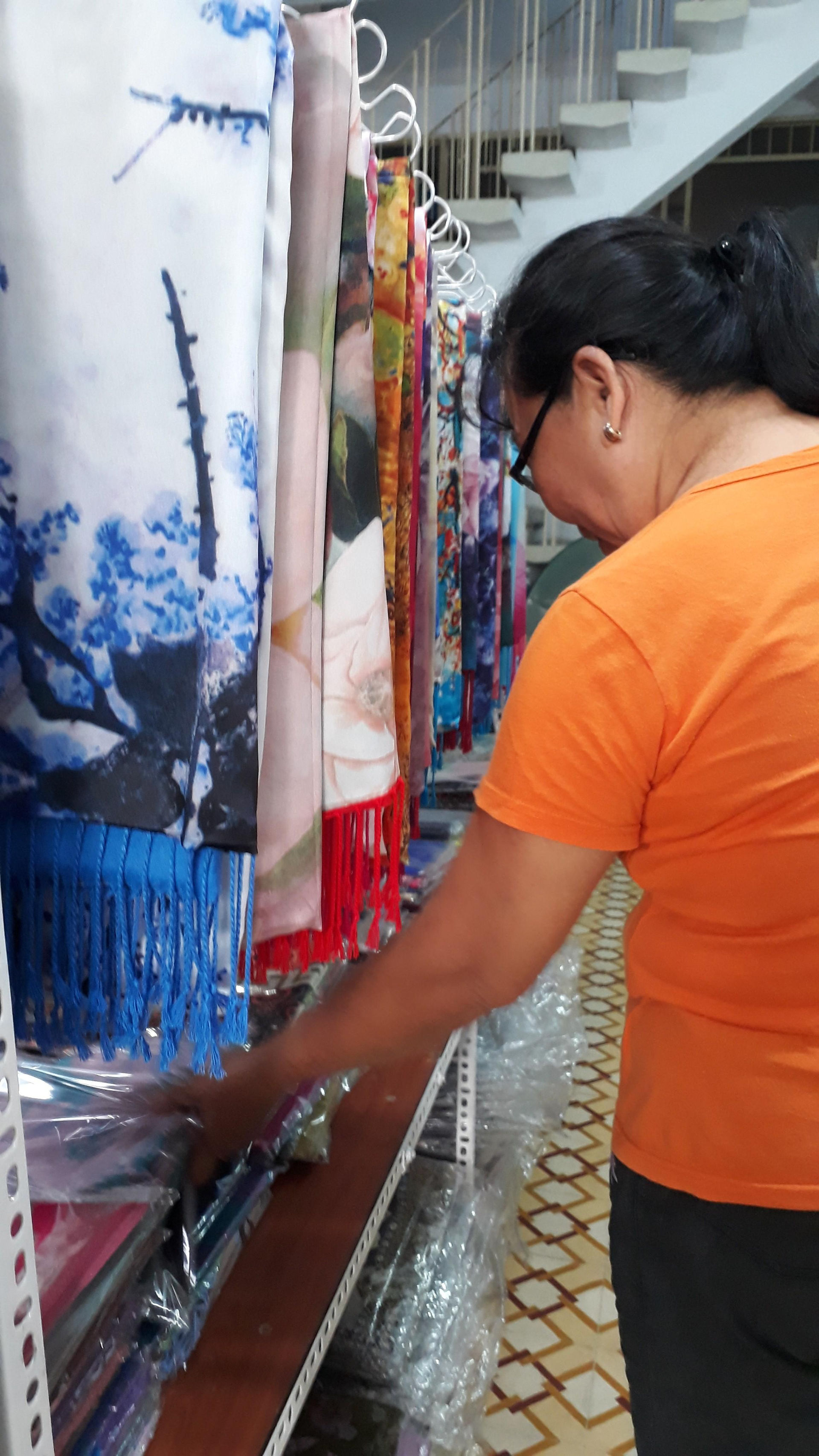 Mua thử một chiếc khăn lụa tại cửa hàng này, chúng tôi nhờ một chuyên gia về lụa kiểm tra, vừa cầm lên ông khẳng định “hàng Trung Quốc!”.