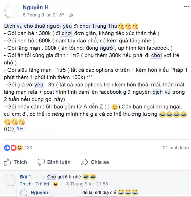 Thực hư dịch vụ thuê người yêu đi chơi trung thu đang rầm rộ trên mạng