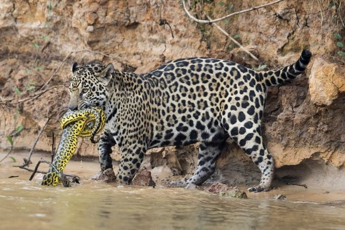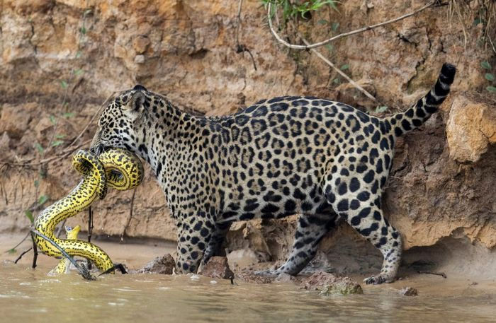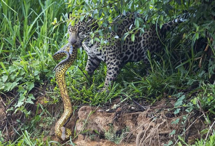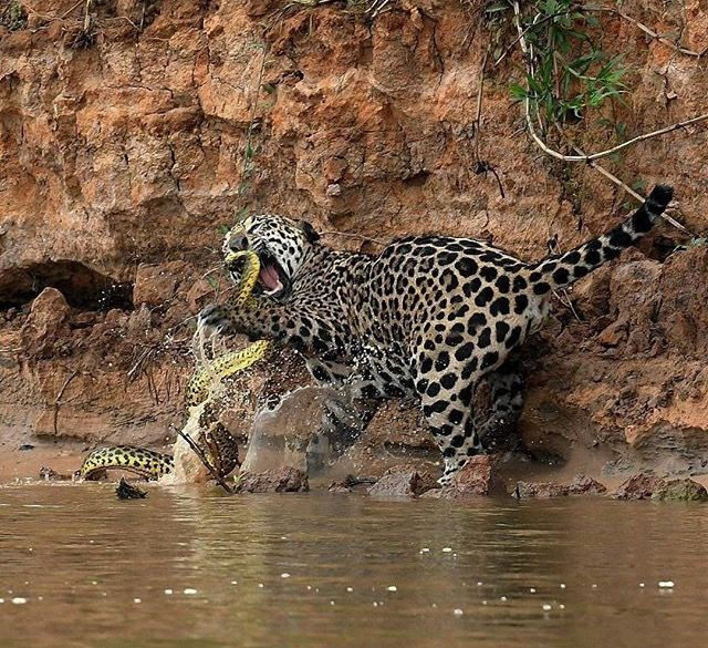 Sự nhanh nhạy và mạnh mẽ của con trăn Nam Mỹ vẫn không địch được chúa tể rừng xanh. Báo đốm cái đã đáp trả con mồi bằng cách sử dụng nanh nhọn, liên tục cắn vào giữa thân con trăn.