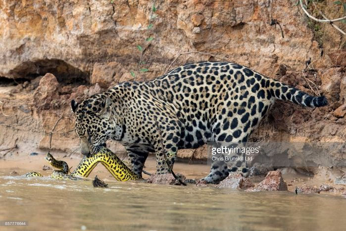 Có vẻ như báo đốm đã đuổi theo con trăn Nam Mỹ, để rồi một cuộc chiến cam go đã nổ ra giữa hai "hung thần rừng già". Không bỏ qua cơ hội bắt được cảnh ngàn vàng giữa thế giới thiên nhiên,Brunskill đã ghi lại cảnh hai con vật đánh nhau suốt 90 giây. "Điều kiện ánh sáng khá tốt, con sông yên bình, dòng chảy chậm, và cuộc chiến giữa báo và trănchỉ cách thuyền của tôi vài mét", Brunskill nói.