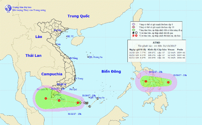 Ngoài ra, hiện nay ở khu vực phía Đông miền Trung Philippin đang có một ATNĐ, vị trí lúc 13 giờ ngày 31/10 ở vào khoảng 11,5 độ Vĩ Bắc; 126,7 độ Kinh Đông, cách đảo Pa-la-oan khoảng 800km về phía Đông, di chuyển chủ yếu theo hướng Tây với tốc độ khoảng 15km một giờ.