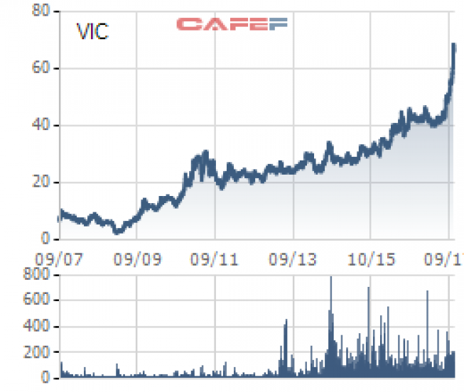 Cổ phiếu VIC đã tăng gần 50% trong 6 tháng gần đây, gần chạm 70.000 đồng/cổ phiếu - mức cao chưa từng có trong lịch sử. Đà tăng giá được nối tiếp khi 1,9 tỷ cổ phiếu VRE của Công ty cổ phần Vincom Retail - một thành viên của Tập đoàn Vingroup đã chính thức niêm yết trên sàn TP.HCM từ 6/11/2017.