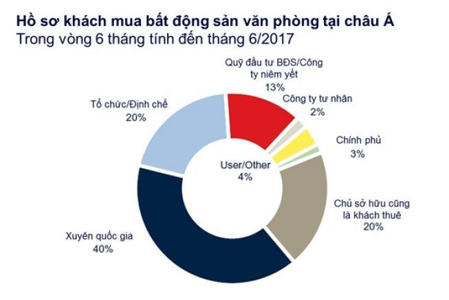 Các nhà đầu tư đang có cái nhìn lạc quan về thị trường văn phòng khu vực châu Á, dựa trên kỳ vọng về tốc độ tăng trưởng nhanh của nền kinh tế. Tổng giá trị giao dịch của các nhà đầu tư nước ngoài đã tăng trong khoảng từ 1-39% trong nửa đầu 2017 so với cùng kì năm ngoái.